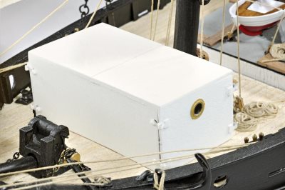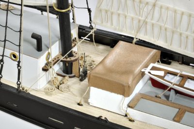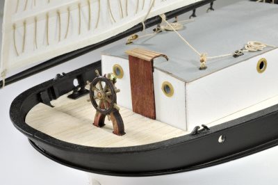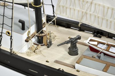 This model represents a merchant ship, armed as a schooner, built at the beginning of the last century and mainly used as a collier. he Hunter was fistly owned by the British Merchant Navy. Then the Royal Navy took it over for its sailing qualities especially fit for the North Seas and decided to transform it into a Q-ship, when war broke out. As all other Q-ships it underwent changes at the dockyard of Queenstown, Ireland (that's why they were called Q-ship). It was equipped with false structures that concealed its deckweaponry. This structure could be easily removed and the hidden deck guns could be used to fire against the enemy, especially submarines.