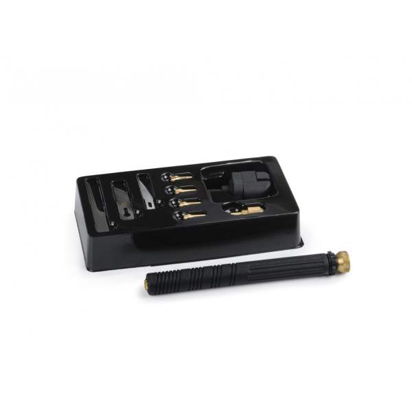 The special set includes 2 knife blades, a mini saw blade, pin vice with 4 brass collets and a very useful handy vice.