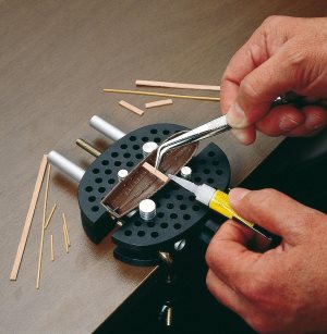 Amati's Versatile modeler's vice holds irregularly shaped objects securely. The Piece is held in place by four metal pegs you insert into each half of the vice. Just change the position of these pegs to accomodate objects of all shapes.