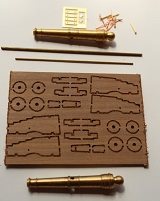 Cannon Kits (sold in packs of 2) include: barrels, wooden carriage assembly, quoin and quoin base, brass trunnion brackets, brass pins, brass eyelets, brass trunnion and bed bolts.