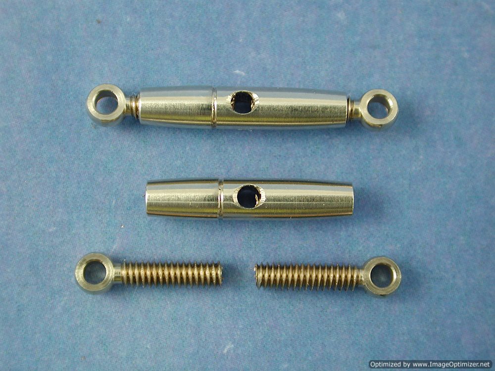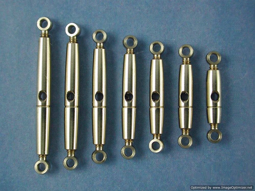 Caldercraft Model Boat Fittings 645322 M2 Turnbuckle 3x22: Working turned brass eye/eye turnbuckle - Body Ø3mm, Body Length 20mm, M2 left/right hand threaded ends, Eye Ø3mm, Hole Ø1.6mm, Operating range 27-41mm. Pack of 2.
