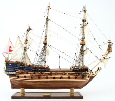 Corels Wappen Von Hamburg is a magnificent example of a 17th century German fighting ship. Technical accuracy in Corel's plank-on-bulkhead kit is superb, and materials are the finest available. All poplar, walnut and other wooden parts are pre-cut. Fittings in gilded cast metal, copper, brass, boxwood and walnut replicate every detail of the original, including the 58 cannon she carried. The lower decks of the finished model can be seen by lifting the upper deck gratings. Plans and instructions, sail material, silk banners, and wooden display cradle complete the kit.