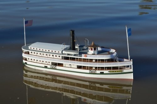 The City of Buffalo is a delightful example of the steamboats that flourished on the resort lakes of the north eastern United States in the late 1800s and early 1900s. Designed by Capt. J. W. Pierce she was built in Jamestown New York, and launched in 1890 on Chautauqua Lake. One of 13 large (125') steamboats built entirely of wood and sheathed in steel, she served the region from 1890 - 1929. Unfortunately like so many of her sisters she was destroyed by fire. This 1/48th scale model of the City of Buffalo is balsa planked over laser cut liteply frames and uses a combination of balsa, poplar plywood and expanded PVC.