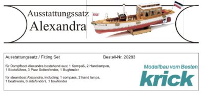Fittings set for the Krick Alexandra.The fittings set includes storm lamps, table lamp, compass, three pairs of side fenders, 1 bow fender, and a pliable figure of the captain.