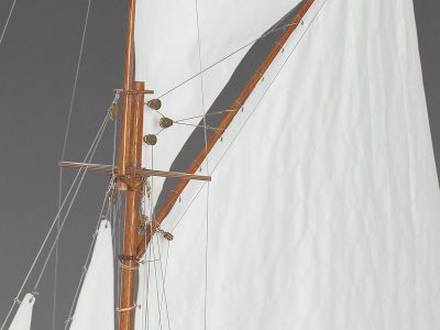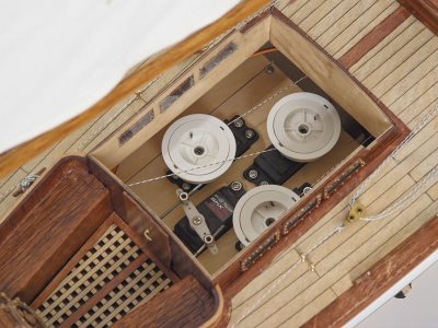 For the sails drawings are included in 1: 1. You can either purchase fabric for sewing or a finished sail set. The detailed construction manual, in which each construction stage is shown in pictures, and also describes the detailed faithful control of the two headsails, and a detailed blueprint make the construction of the model even for the non-expert easily possible. The equipment can be done with 2 or 3 sail winches. The winches can also be installed only after completion of the model.