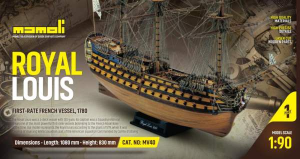 The Royal Louis was a 3-deck vessel with 120 guns. Its captain was a Squadron Admiral. It was one of the most powerful first-rank vessels belonging to the French Royal Navy at the time. Our model represents the Royal Louis according to the plans of 1779, when it was flagship of Blue and White Squadron, part of the American squadron commanded by Comte dEstaing.