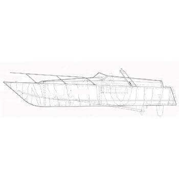 Ultra simple model for 1.5 - 2.5cc engines, 27in (685mm) long and 9.5in (241mm) beam. Also suitable for electric power. Only eight pieces make the hull itself Additional optional details shown, Excellent for beginners, surprisingly good performance with or without radio.