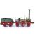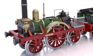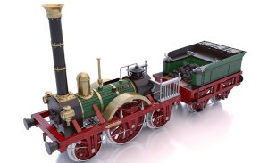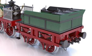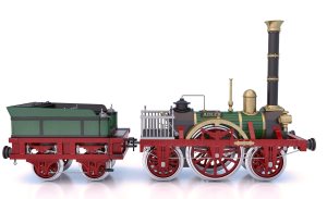 This locomotive, which was manufactured by Robert Stephenson & Co. of Newcastle, was shipped in pieces from Newcastle to the Port of Rotterdam, from there it was transported up the Rhine to Cologne, and from Cologne, with a great deal of difficulty, it had then to be transported overland to Nuremberg. When it finally reached its destination it was put back together at the workshops of Johann Wilhelm Spaeth. The coaches were built in wood by local workshops.