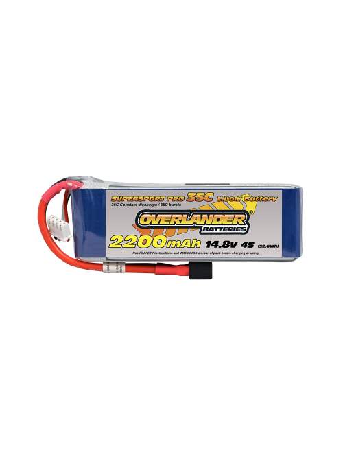 The 2200mAh 14.8V 4S 35C LiPo battery is part of Overlander's Supersport Pro range. This is our most comprehensive collection ever and is no doubt our most popular range of lithium batteries. It is perfectly designed to cater for almost every application and user alike. With a constant discharge rating of 35C, hitting a peak of 65C in bursts, it is no wonder that these batteries are loved so much! The huge selection of capacities and voltages makes it almost impossible not to find the perfect battery for you within this range. Offering low weight and compact sizing, our Supersport Pro LiPo battery range is a must