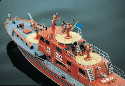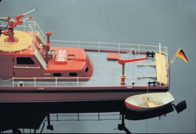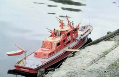 The plastic hull is moulded in thick-walled material, and it offers plenty of space for the numerous mechanical and electronic parts required for the auxiliary working systems. The model is propelled by two proven MAX Gear power systems, giving it an impressive turn of speed. Four large rudders guarantee extreme manoeuvring capability both forwards and astern. The fire monitors can be swivelled horizontally and vertically from the transmitter, and with the recommended electric geared pump they can fire a jet of water a distance of 6 - 8 m. If a working boat crane is fitted, the vacuum-moulded rowing boat can be raised, swung outboard and lowered to the water in true scale style.