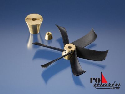 Plastic propeller blades. CNC-machined brass propeller hub, taper collet and retaining nut. 100 mm Ø (assembled). 1 set