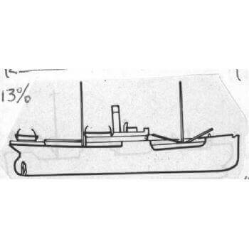 A typical well-deck steamer of the 1910-30 era at 1:46 scale, length 46in., beam 7in., displacement up to 25lb. Profile and deck plan, body plan, no model construction shown.