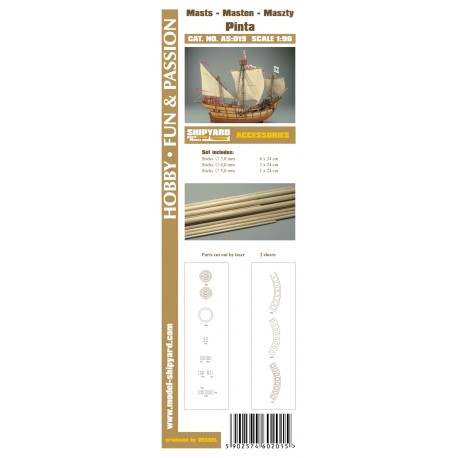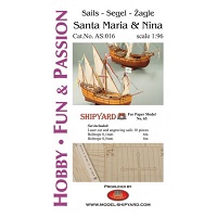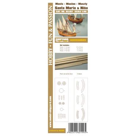 Accessories for making Masts and Yards Santa Maria & Nina2 pages with laser cut partssticks diameter 1,8 mm - 7,5 mmscale 1:96These fittings are for use with the Shipyard range of paper and card models