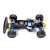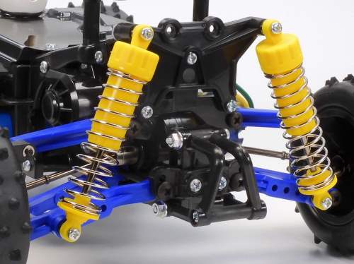 Durable chassis features motor mounted amidships, which powers all four wheels via a shaft drive system. The simple, yet effective, suspension is made up of upper I-arms and lower H-arms for an efficient double wishbone setup. CVA oil dampers at all four corners help absorb shocks from rough terrain while differential gears in the front and rear gearboxes help put the power to the ground smoothly.