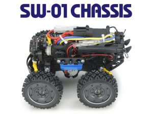 190mm long and 150mm wide, the SW-01 is a compact, highly fun 4WD chassis. A Type 370 motor is central in the slim monocoque frame, with gears transmitting its output to the front and rear of the model, where 70mm tires translate it into a powerful drive. The chassis power source is mounted in the top section to allow wild wheelies under acceleration. Strut type 4-wheel independent coil sprung suspension utilizes single piece upper arms to link left and right wheel steering motion, helping suppress roll during turns, and together with front and rear differentials realize a tight turning circle.