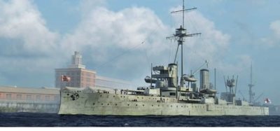 HMS DREADNOUGHT was the first all-big-gun battleship and represents an important watershed in battleship technology. Laid down in October 1905, launched in February 1906 and completed in December 1906, its ten twelve-inch guns, powerful steam turbines and fast speed outclassed all previous battleships, subsequently known as 'pre-Dreadnought'. DREADNOUGHT served as flagship of the British Royal Navy Home Fleet from 1907 to 1912. In the First World War, on March 18th 1915, DREADNOUGHT rammed and sank the German submarine U-29. DREADNOUGHT was in drydock for refit and missed the Battle of Jutland. From 1916 to 1918 DREADNOUGHT defended the Thames estuary against bombardment from German battlecruisers. Transferred to the Reserve Fleet in 1919, DREADNOUGHT was sold for scrap in 1921.