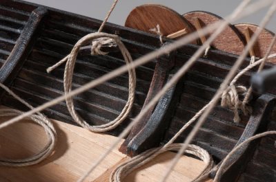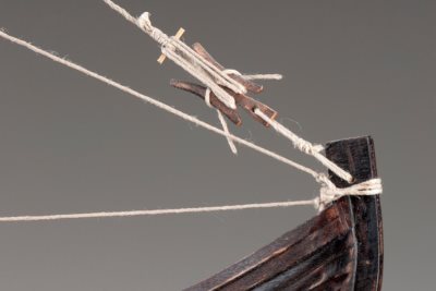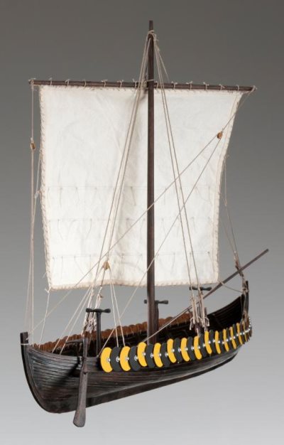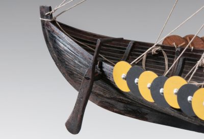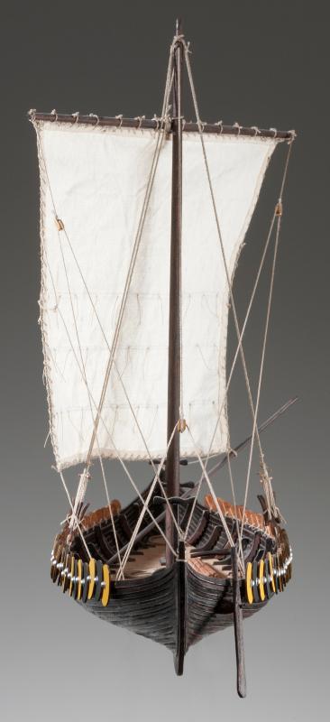 This model represents a Viking ship found in year 1880 near village Gokstad in Norway. The ship was built in second half of ninth century. Excellent nautical ability of the ship was demonstrated in the year 1893 when a replica built by Magnus Anderson took a journey from Norway to USA. Total length of the ship was 24m. A keel and planks were made from oak wood. The ship was propelled by 32 oars and one rectangular sail.