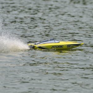 Coming pre-assembled and finished in two striking colour schemes, the Atomic, with its ABS moulded unibody hull features a 2.4ghz radio system, 40Amp brushless speed control and water cooled brushless outrunner mo-tor all installed at the factory. All you have to do is charge the Lipo battery, add AAs to your transmitter and you are all set for the water.