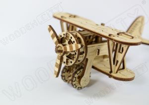 The BIPLANE model has a rubber-band driven propeller (a "rezinomotor") with adjustable acceleration. Its blades spin and the plane quickly accelerates on a flat surface!