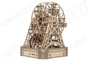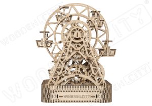 One of the oldest rides, recognizable to everyone since their childhood, is the Ferris Wheel. When you ride this, you can look down and get a full view of the city! More than 120 years ago, the idea of creating a tall wheel that transported observation booths to a great height seemed impossible. But then a young engineer followed his dreams and George Washington Gale Ferris built the first wheel, which was designed to carry 2,160 passengers. Today this invention carries his name - FERRIS WHEEL. Our wheel is actually a wooden jigsaw puzzle. It is difficult to build, but thats what makes it fun. And the result will delight the whole family! Do you want to feel like an innovator from an earlier era? A few turns of the key and your rubber band motor-driven "Ferris Wheel" starts right up! It sets gears in motion, including one attached to a flywheel, and a real planetary gear. On just one winding, the operational time is one whole minute. On your right is the release lever used to stop the movement of the wheel. In each of the six booths are passengers. But that is not all! At the bottom of the pattern-adorned stand is a mini-box and a hidden piggy bank - a surprise for your loved ones. Your children will wind up the wheel dozens of times and love to play with it. As their parents, youll enjoy a half hour of peace and quiet. The open mechanism with its rotating gears and the specially carved stand with its beautiful patterns will attract the attention of your friends and acquaintances. Your new passion will become the topic of conversation in any company.