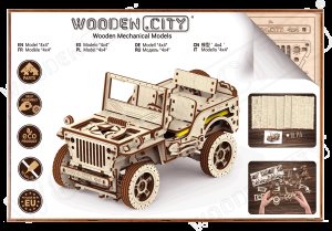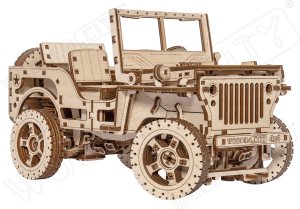 Our "4x4" drives up to 2 meters. After assembly, set the lever position to forward or backward, put the locking lever in the stop position, wind up the model with the key (youll find the key in the spare wheel) and then lower the locking lever. The jeep has front wheel-steering. The hood opens and closes and is secured with two clips, and the windshield tilts. This is the perfect model for playing with boys! Villains, spies, and the main heroes rush to their jeeps, and all the villains win! You can set up a "safari race" around all their toy animals. Our "4x4" will be the "crown jewel" of your collection of self propelled wooden models.