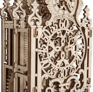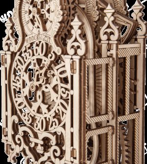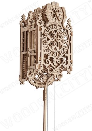 Our Royal Clock is a 3D wooden puzzle of advanced complexity. This is an uncommonly beautiful Rococo-style clock model, refined, delicate, and with fancy interlaced details carved into it. Its lines are elegant and refined. Perhaps under such a clock lovers embraced during a carnival in the royal palace. Or maybe the king himself received diplomats from other important countries. It has two dials: a small one with an hour hand at the top and a large one with a minute hand in the middle of the model. The passage of time depends on the number of coins that you put in the special cage that serves as the bob of the pendulum. Because extra weight changes the pendulums center of gravity and the amount of friction acting on it, the more coins you insert, the longer will be its period (and slower its operation). You can wind up your fabulous clock by pulling the winding chain down, just like you would with a real cuckoo clock. The ticking will be heard in the room for 12 hours. The Royal Clock is a specially assembled masterpiece designed for connoisseurs and decorated with thin, intricate patterns that are combined in accordance with exact calculations governing the mechanics of its parts. Truly it would make a royal gift for your family and friends. Let your house be beautiful!