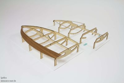 The Spitfire is a model of an Outboard Racing Boat. Like the full-size vessel, our 1 : 5.2 scale model is of all-wood construction. All the mahogany and birch plywood parts are laser-cut, and the hull is quickly assembled on the building jig supplied in the kit. The kit contains all the wooden parts, fittings, covering and jig, plus etched German silver components.