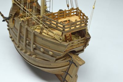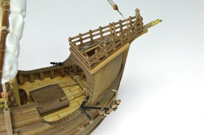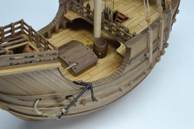 The carrack, or Spanish coca, is a type of ship built in the XV century and it was widely used as merchant ship. It generally featured two castles, one at stem and one at stern, in order to defend the load from pirate attacks. From the top placed on the long mast, sailors could easily monitor the sea. This ship had a unique appearance with its mast almost as long as the hull and with the round and large hold.