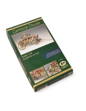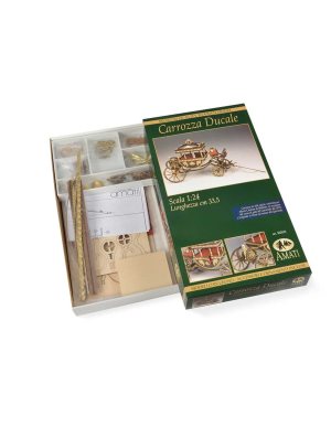 The kit includes pre cut wooden parts, machined turned wooden spokes and columns, brass decoration, velvet paper for the inner carriage lining, brass chains, gilded metal Egyptian figure, and a detailed set of plans and building instructions.