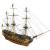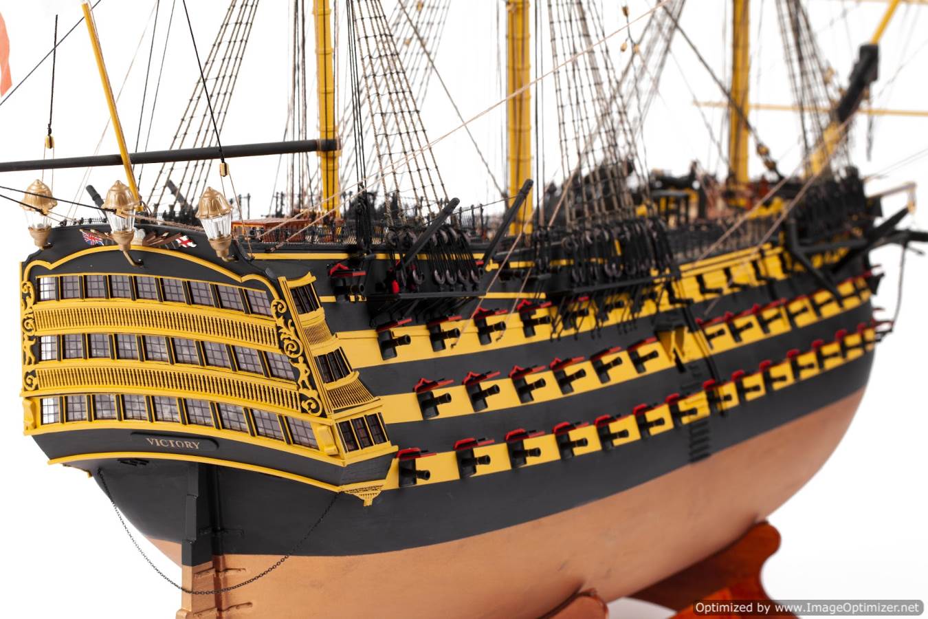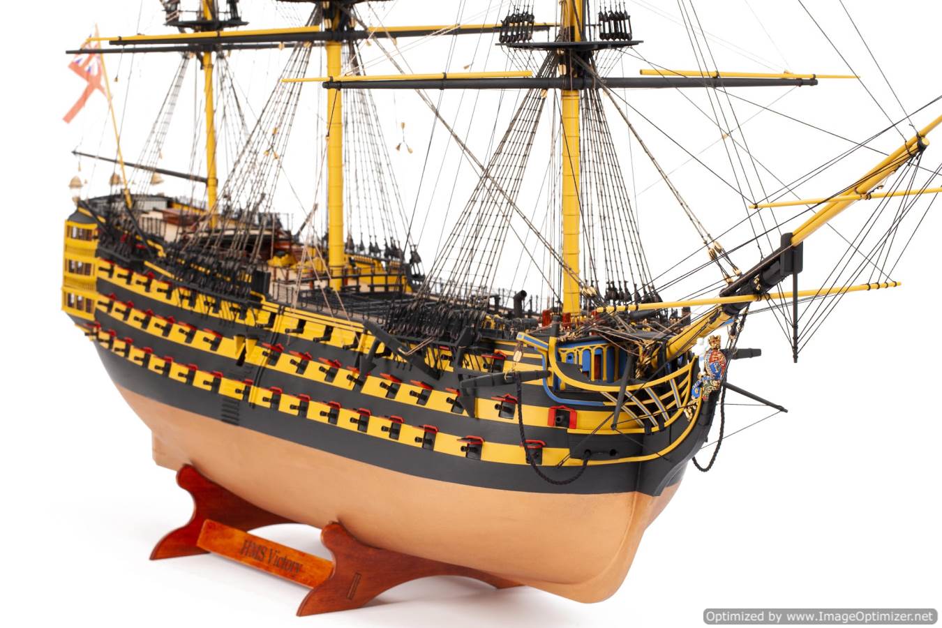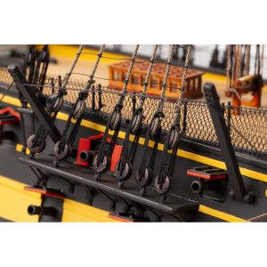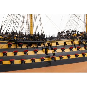 The model is a beautiful double-planked "plank-on-frame" lasercut woodenship, with brass cannons, wooden blocks and a beautiful bronze cast figurehead. The model is a complete replica of the actual ship that lies in dry-dock at Portsmouth. The Model is one of the largest kits on the market produced of the HMS Victory, in Scale 1:75, Length 134 cm from stern to bowsprit, and with a height of 89 cm.