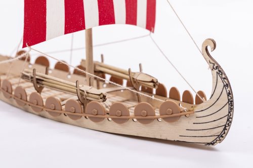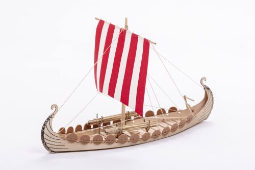 This is a mini replica of our 1:25 scale Oseberg. Wooden hull, Beginner level 1:50 scale. Kit includes laser cut wooden strips and pieces, fittings set, sail, rigging thread, plan and manual.