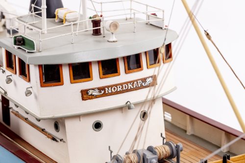 Billing Boats (B476) NordKap Fishing Trawler - Model Boat & Fittings is a scale model of a typical trawler from the North Sea, built in1970 at an English shipyard. The model kit isbased on the original ship drawings. Tonna-ge: 185 gross register tonnage Length ove-rall: 40.0 m - Beam: 9.30 m - Motor: 1000 HPdiesel Engine speed: 12-14 knots Crew: 7-8 men Fishing tackle: Drag net (trawl) Fishing area: Around Iceland and Greenland Haul: Herrings, cod and trash fish.