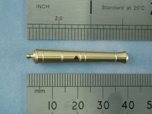 Sold in packs of 2, these turned brass carriage gun barrels are faithful to the originals of Circa 1790, even including an authentic trunnion hole drilled off centre. Gun length: 45.5mm.
