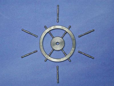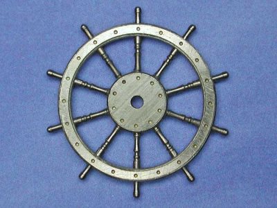 All brass ships wheel. Sold individually this wheel consists of turned brass inner hub and outer rim, each pre-drilled to accept the 10 turned brass spokes. The wheel is finished with etched brass detail for the inner hub and outer rim which is applied to both faces.