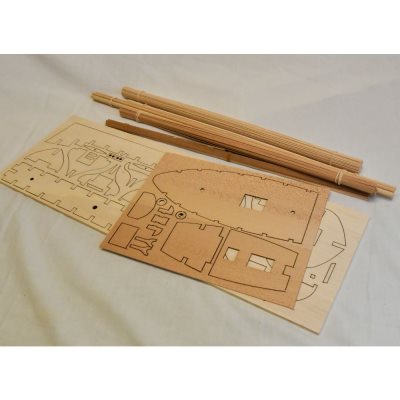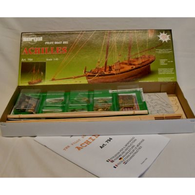 The Sergal Kit of the Achilles Features: A double plank on frame hull construction, building plans with general details English instructions, lost wax brass castings walnut and lime planking, wooden masts and spars, brass and walnut fittings, laser engraved details, rigging cord and silk flag. All sheet ply sections are laser cut for accuracy.