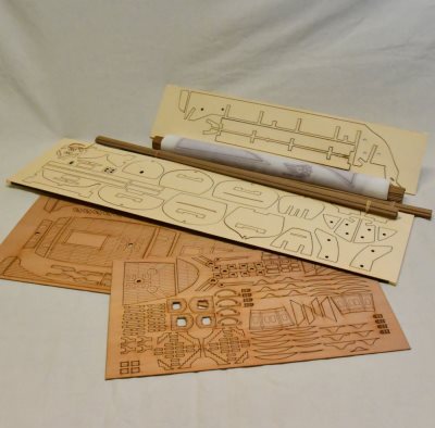 The Mantua kit features the following: A plank on frame hull construction, building plans with general details, English instructions, lost wax brass castings walnut or lime planking, wooden masts and spars, brass and walnut fittings,lifeboat, etched brass details, rigging cord, silk flag. All sheet ply sections are laser cut for accuracy.