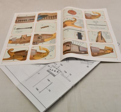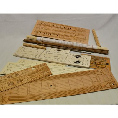 The Mantua kit features the following: A plank on frame hull construction, building plans with general details English instructions, walnut or lime planking, wooden masts and spars, brass and walnut fittings, etched brass details, rigging cord, printed sails, tent and royal standard. All sheet ply sections are laser cut for accuracy.