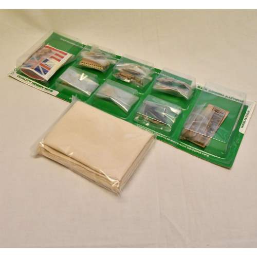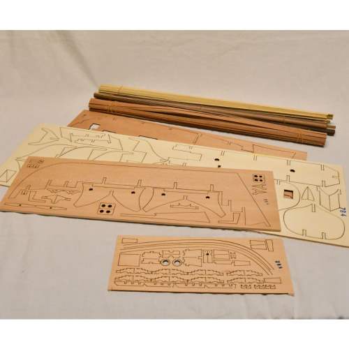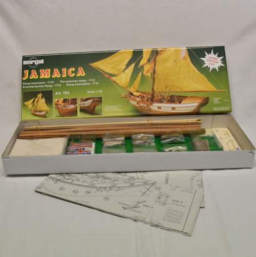 The Sergal Kit of the Jamaica Features: A double plank on frame hull construction, building plans with general details, English instructions, lost wax brass castings, brass and walnut fittings, walnut and lime planking, wooden masts and spars, rigging cord, sailcloth and silk flag.