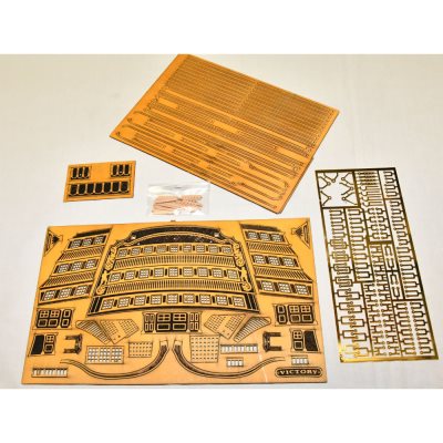 The Mantua HMS Victory kit features the following: A double plank on frame hull construction, building plans with general details, English Instructions, lost wax brass castings, walnut or lime planking, wooden masts and spars, brass and walnut fittings, etched brass details, rigging cord and silk flag. Now revised with laser etched stern galleries. All sheet ply sections are laser cut for accuracy.