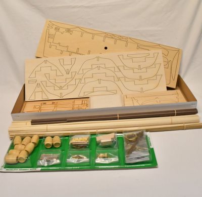 The Panart kit features the following: A double plank on frame hull construction, building plans with general details, English instructions, walnut and lime planking, wooden masts and spars, brass and walnut fittings, rigging cord, sailcloth and silk flags. All sheet ply sections are laser cut for accuracy.