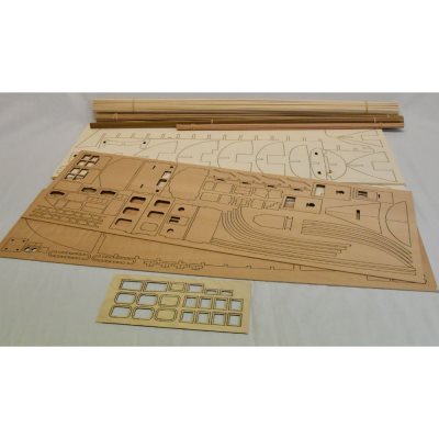 The Mantua kit features the following: A plank on frame hull construction, building plans with general details English instructions, walnut or lime planking, wooden masts and spars, brass and walnut fittings, etched brass details, rigging cord and silk flag. All sheet ply sections are laser cut for accuracy.