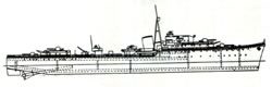 A simplified scale destroyer. Model is 816mm loa by 75mm beam in size, 1:128th scale, of all balsa construction. Two function RC, electric motors. Designed by Stuart Bolton. Featured in: MM May 1989 2 Star Difficulty Rating