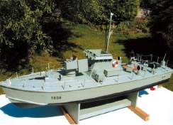 Two sheet plans for a working model of an RN patrol boat. At 1:32nd scale, 715mm loa by 195mm max beam, and presented as fullsize side and deck elevations, frames and deck details. Fullsize triple screw layout shown, but can be used with single electric motor power. Designed by Les Brown.