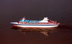 General lines and elevations for a 1:128th scale working model of the Royal Caribbean Cruise Liner built by Wartsila in 1970s. Model length 1500mm by 185mm beam, plans for experienced modellers only, with no model construction data or fine detail. Designed by Charles Sells.
