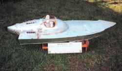 Electric powered 1:12th scale model of Hubert Scott- Payness powerboat. Design developed as practical working model using geared 540 motor and seven cells from photos and contemporary drawings. Model length 700mm by 210mm beam. Designed by Graham Charles.