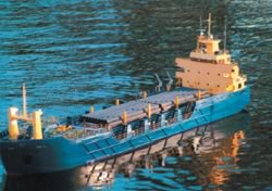 Specially built to supply pipeline material for offshore oil rigs, now used for general duties. Unusual model at 1:125th scale, length 710mm and 150mm beam. No model construction data. Designer Jim Pottinger