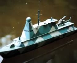 Freelance modern 'stealth' technology corvette/frigate. Model is 900mm length and 150mm beam. Simple construction in balsa and ply, for single electric motor. Designer Hal Harrison Featured in: June 2003 MMI 2 Star Difficulty Rating