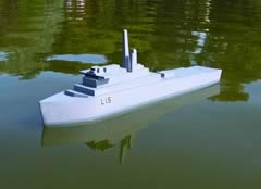 Simplified semi scale RN assault ship based on HMS Fearless. Length 840 mm and beam 130 mm. Balsa and ply construction for two-function radio and electric drive. Designer Martin Garrett.Featured in October 07 MMI Plans Special Issue1 Star Difficulty Rating