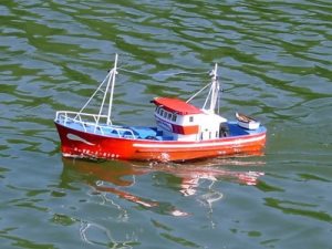Mediteranean Style fishing boat with typical flared bow. Designed for building in timber and styrene blocks but could be planked. Model size is 540 mm length and 150 mm beam weight 2.5 kg and plans shows model construction and jigs. Designed by David Heaps