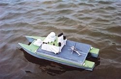Two sheet plans for a semi-scale catamaran corvette at 1:72 scale giving hull length 700 mm and overall beam of 260 mm. Twin electric motors and rudders simple balsa and ply construction. Designer Clive Halliwell